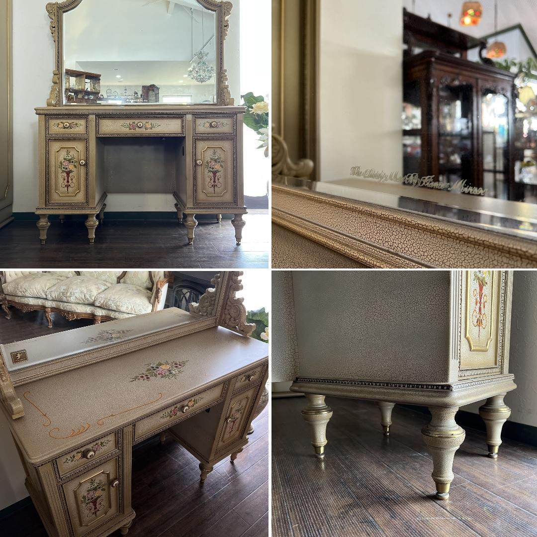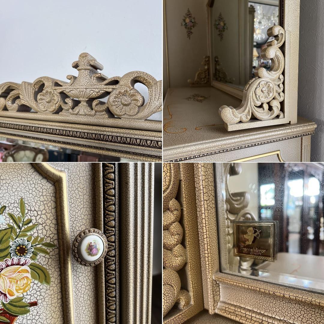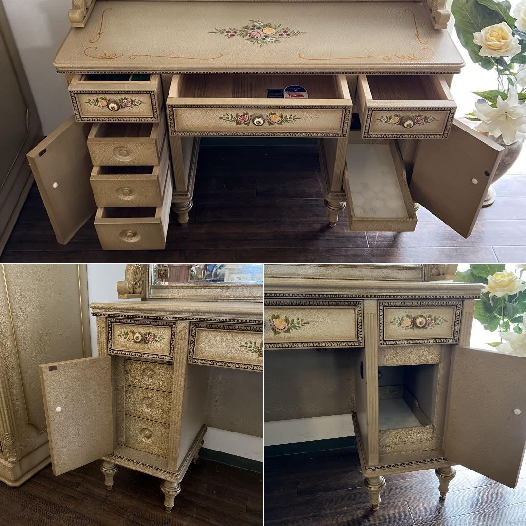 クリーム色の花柄装飾が施された木製のアンティーク風ドレッサー