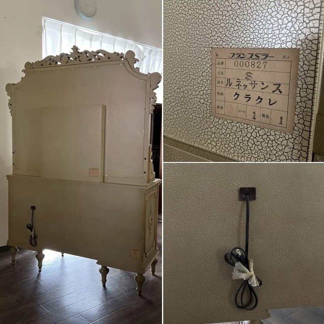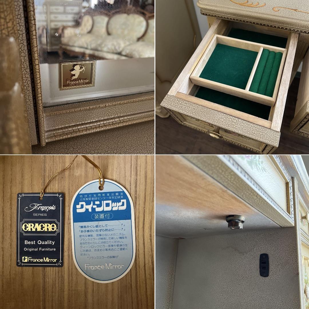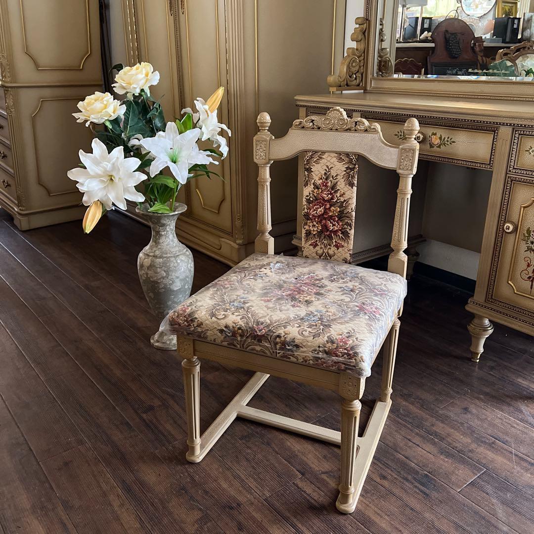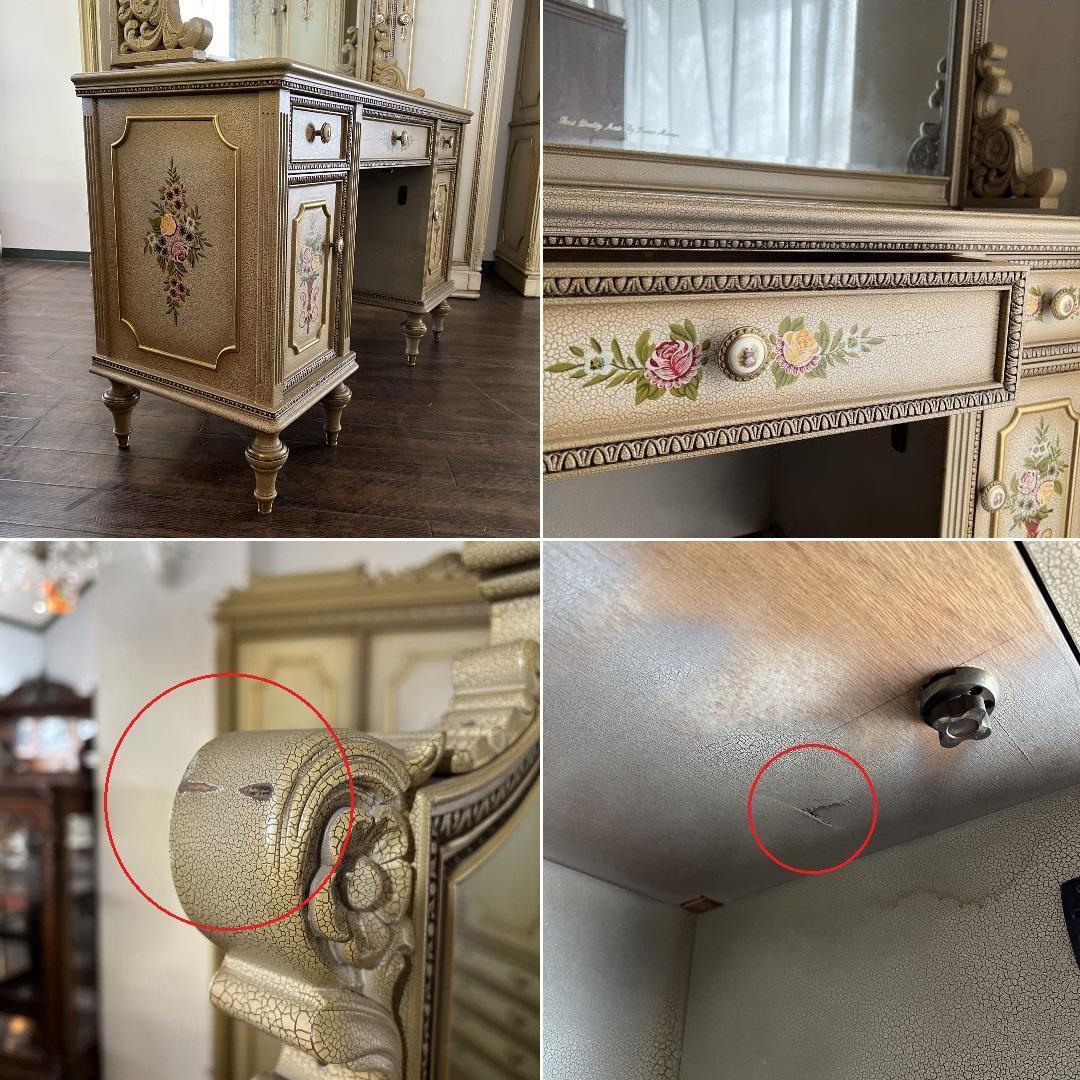 クリーム色の花柄装飾が施された木製のアンティーク風ドレッサー