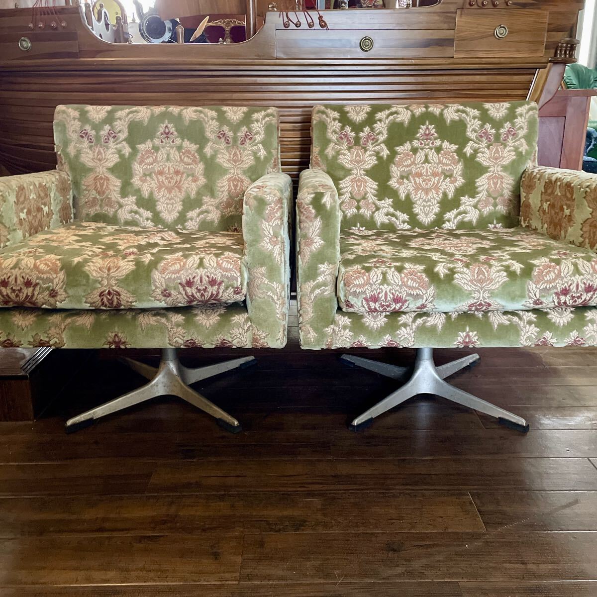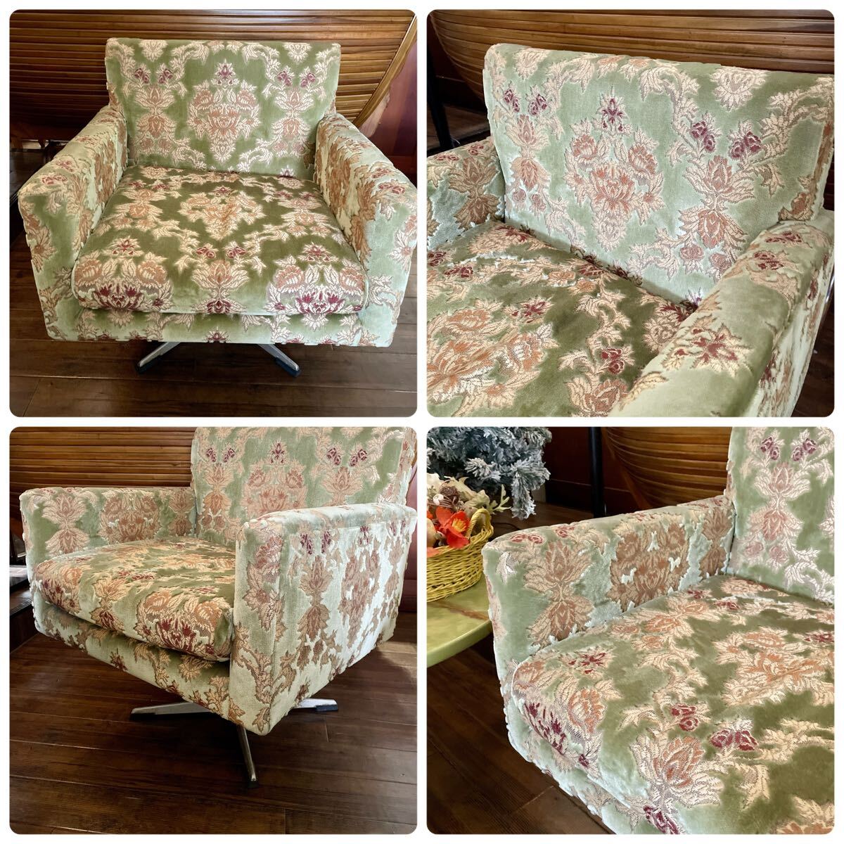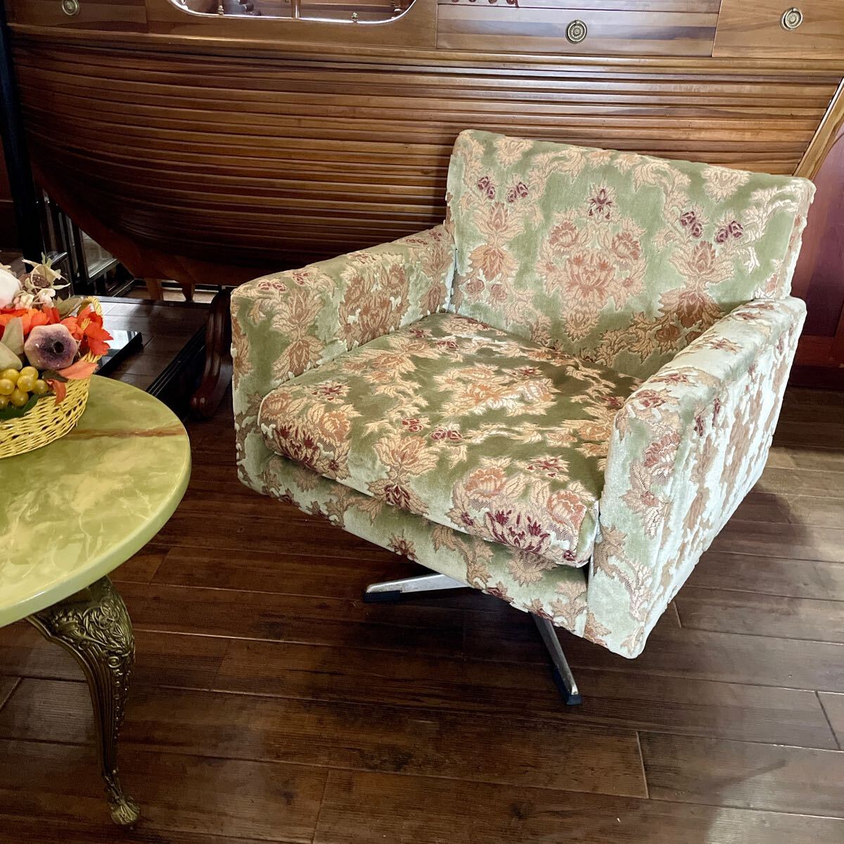 高級感のあるエレガントな生地にシンプルなスチール脚がとてもレトロ。ゆったりとした座り心地のチェアです。