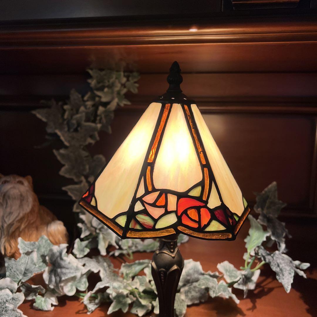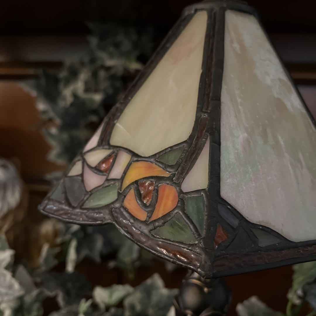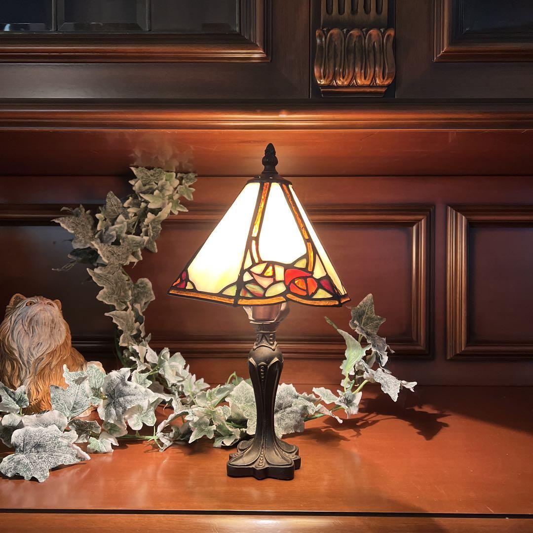 アールヌーヴォ様式のお洒落なステンドグラスランプ テーブルランプ ローズ 樹脂製土台 三角シェードのスリムなシルエットの逸品