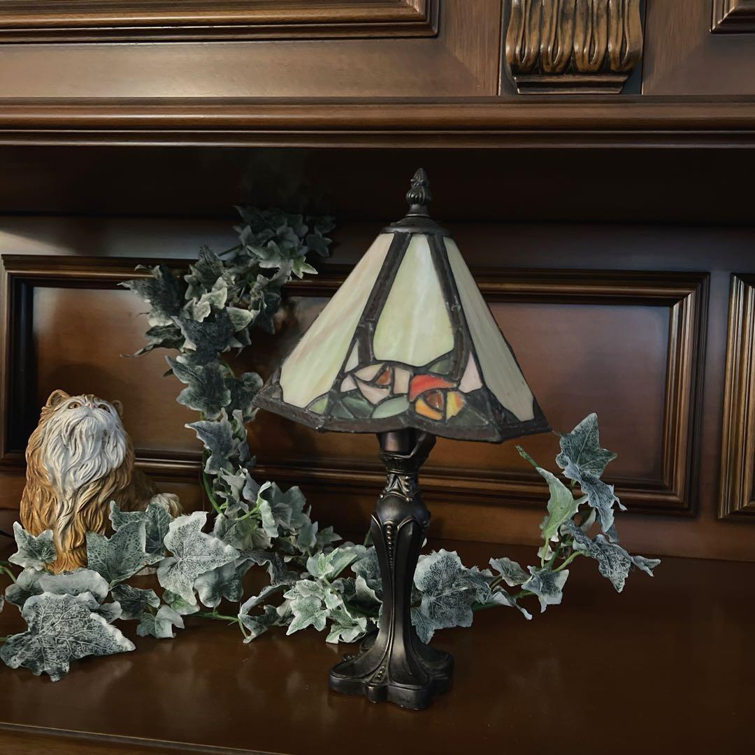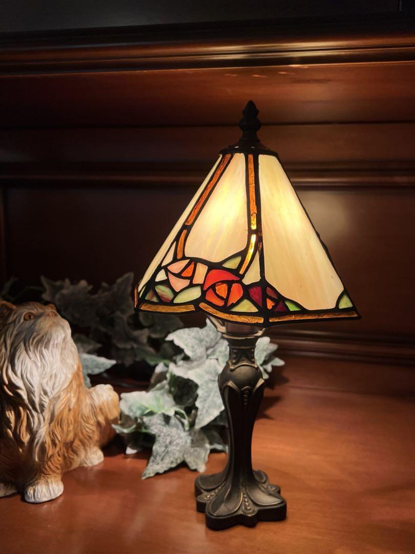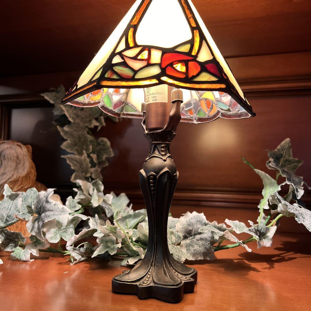 アールヌーヴォ様式のお洒落なステンドグラスランプ テーブルランプ ローズ 樹脂製土台 三角シェードのスリムなシルエットの逸品