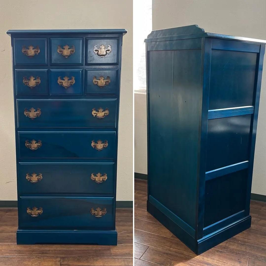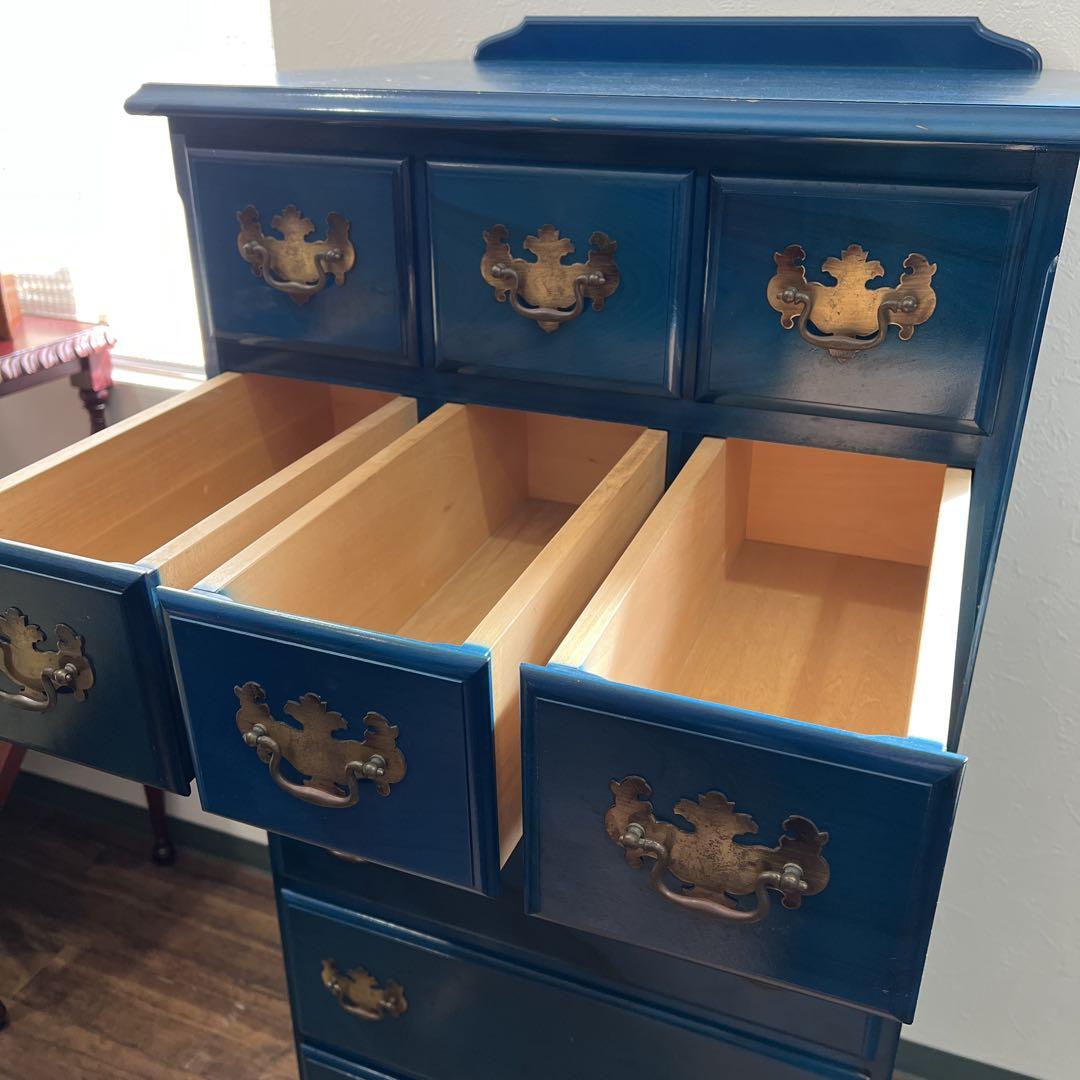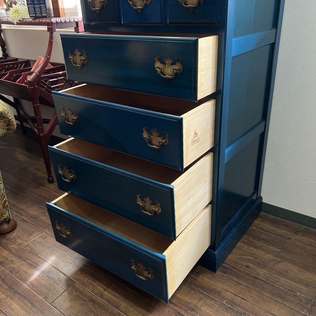 アメリカとヨーロッパの家具様式を織り交ぜた、アーリーアメリカンシリーズのチェストです。パッと目を引くブルーですが、深みのある味わいがにじみ出るようなお色となっております。