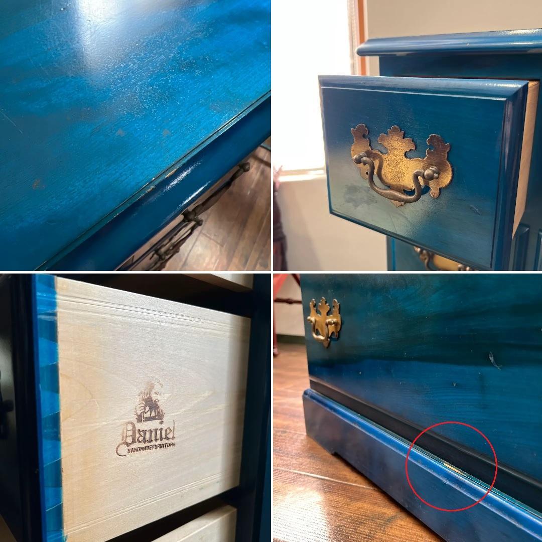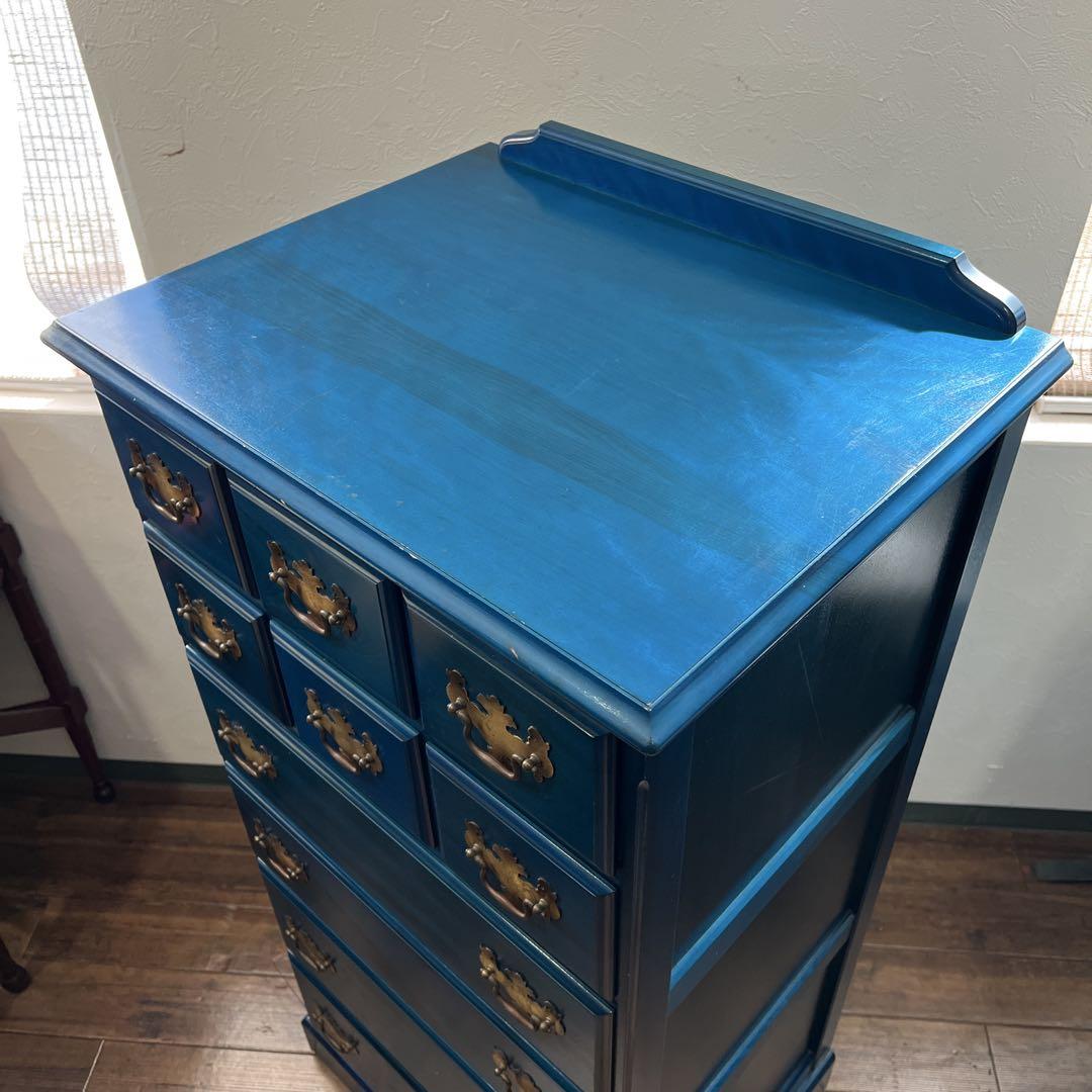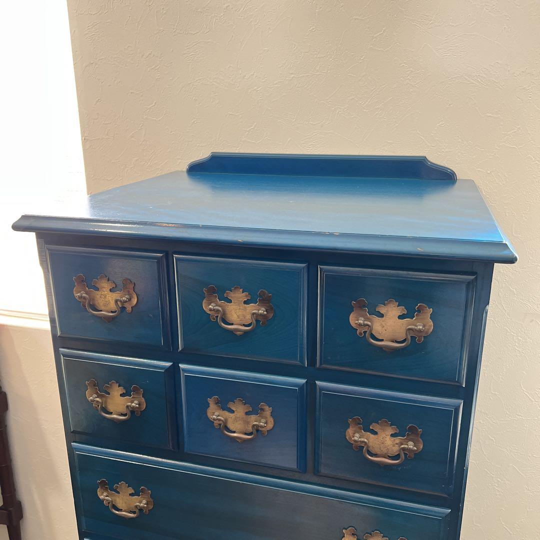 アメリカとヨーロッパの家具様式を織り交ぜた、アーリーアメリカンシリーズのチェストです。パッと目を引くブルーですが、深みのある味わいがにじみ出るようなお色となっております。