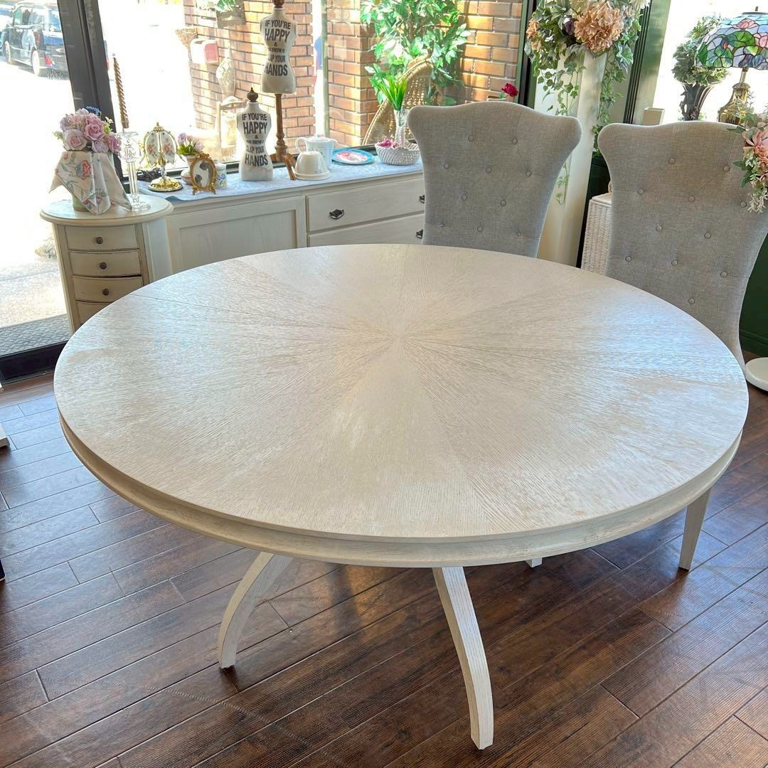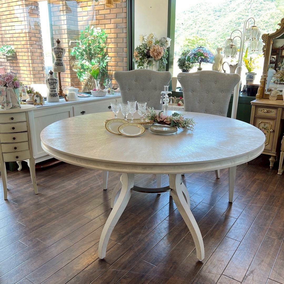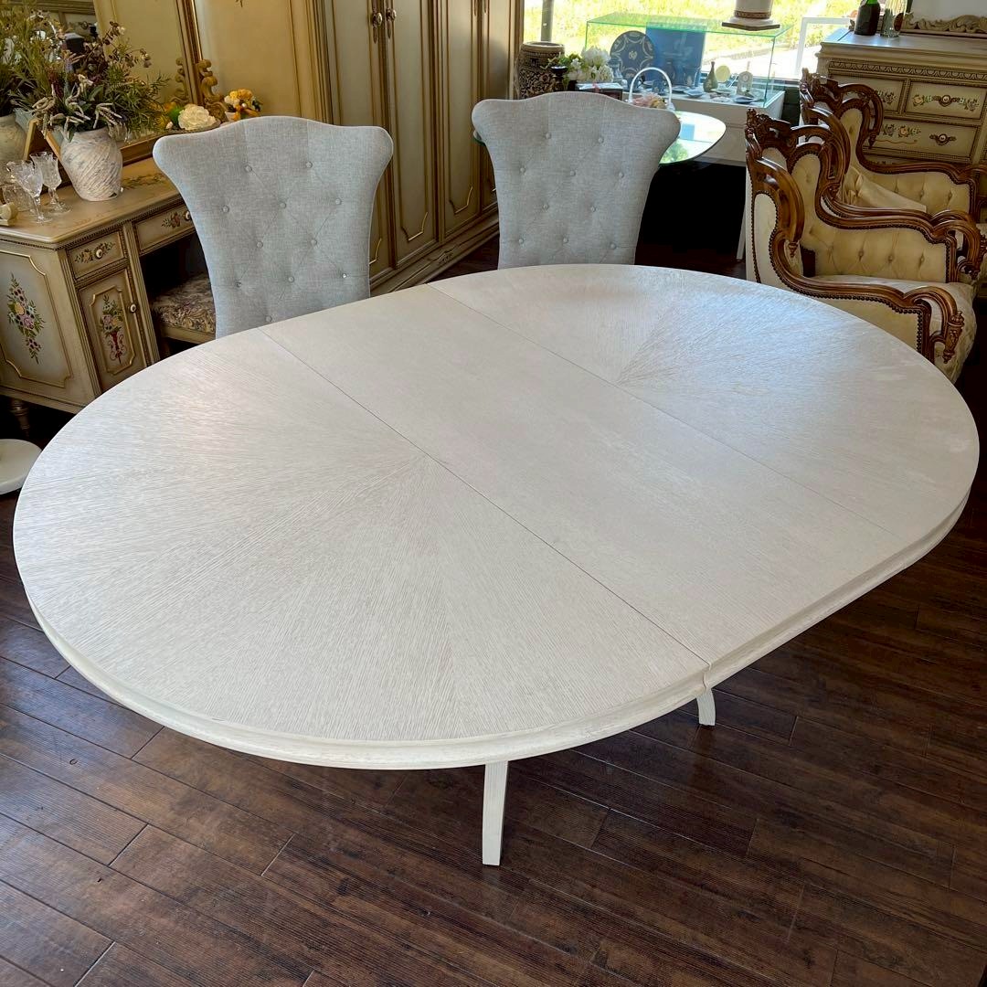 フレンチシックなスタイルのダイニングセットは、明るい日差しの差し込むお部屋がよく似合います。テーブルは大きな楕円になりますので、来客のある時にも便利です。
